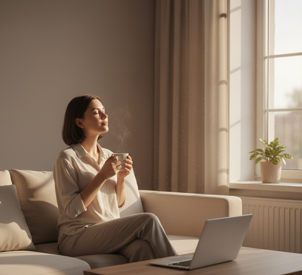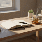 Minimalist workspace with warm light symbolizing calm productivity and focus.